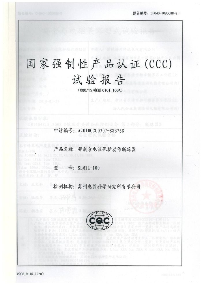 SLM1L-100塑殼斷路器資質(zhì)證書