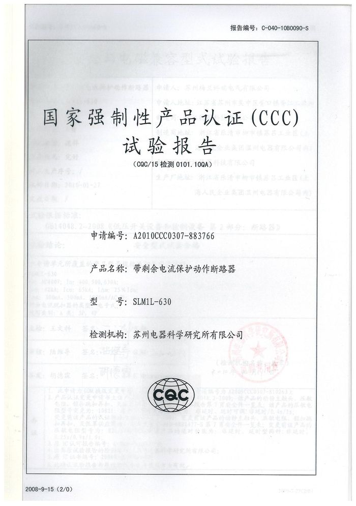 SLM1L-630塑殼漏電資質(zhì)證書(shū)