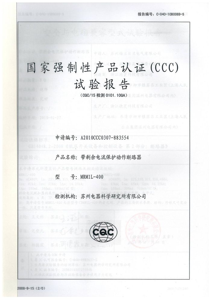MRM1L-400塑殼漏電資質(zhì)證書