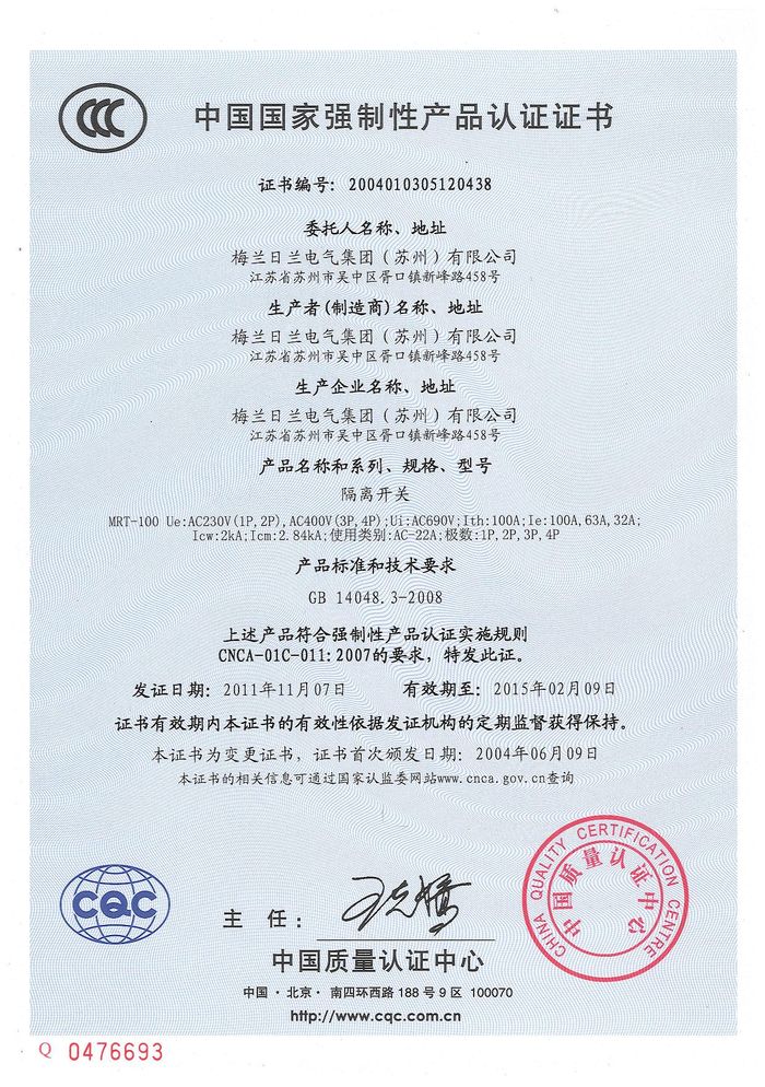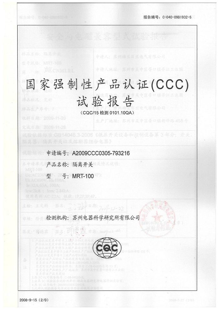 MRT-100隔離開(kāi)關(guān)資質(zhì)證書(shū)