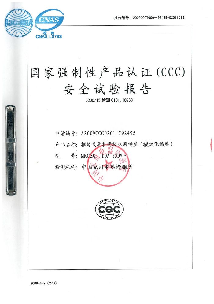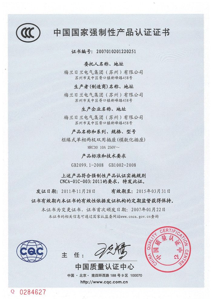 MRC30模數化插座資質證書