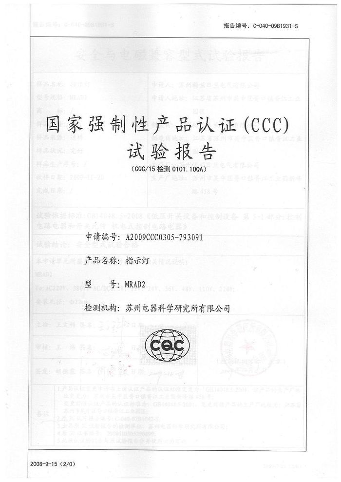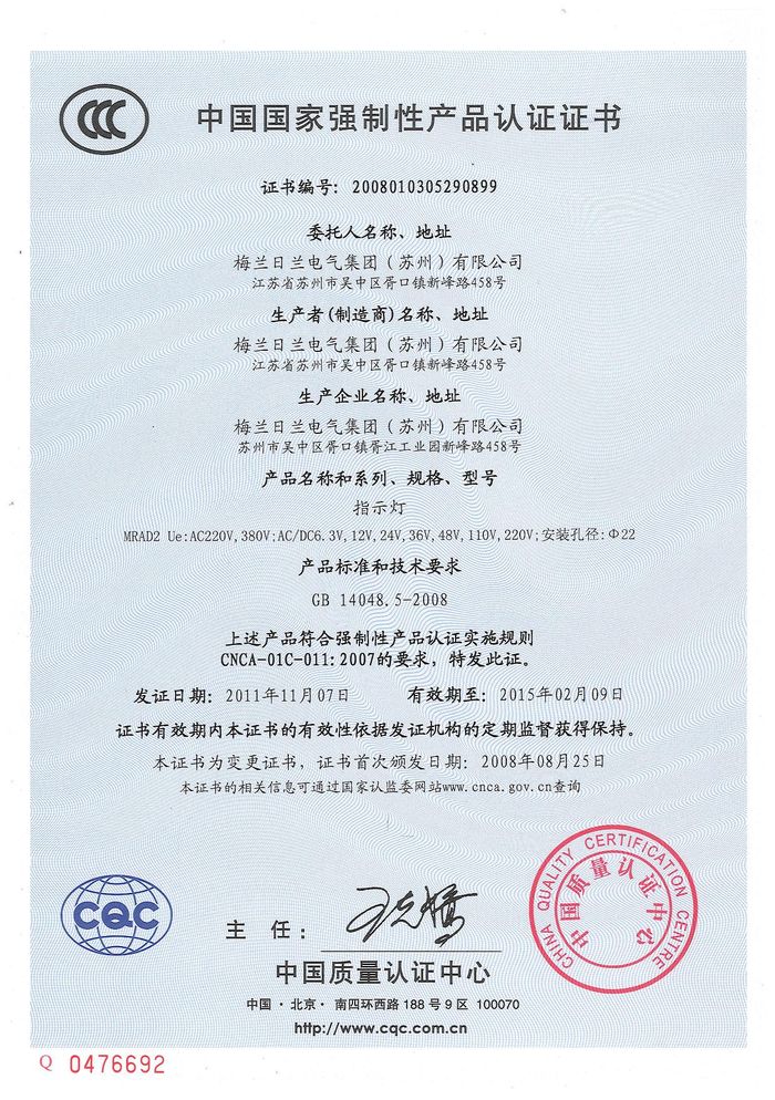 MRAD2指示燈資質(zhì)證書