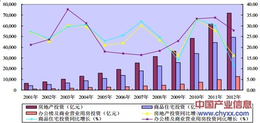 2001-2012年房地產(chǎn)投資、商品住宅投資、辦公樓及商業(yè)營(yíng)業(yè)用房投資和變化趨勢(shì)