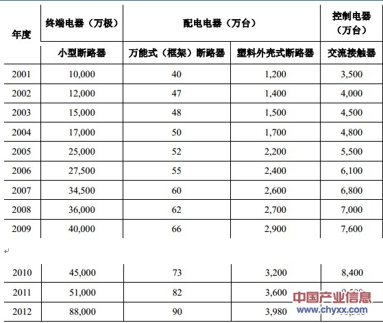 根據(jù)中國(guó)電器工業(yè)協(xié)會(huì)的統(tǒng)計(jì),2001 年至 2012 年主要低壓電器產(chǎn)品的產(chǎn)銷量呈逐年上升趨勢(shì),低壓電器產(chǎn)品保持較快速度增長(zhǎng),終端電器、配電電器、控制電器產(chǎn)量復(fù)合增長(zhǎng)率分別為 21.86%、11.41%、10.50%,今后較長(zhǎng)一段時(shí)間內(nèi)我國(guó)低壓電器市場(chǎng)容量仍會(huì)穩(wěn)步增長(zhǎng)。