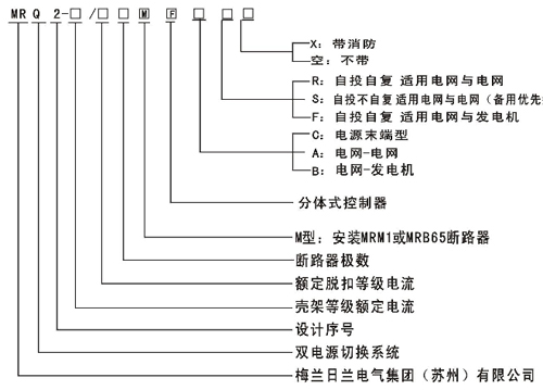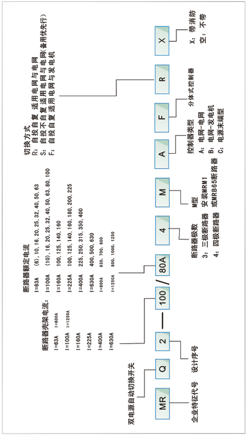 用戶在訂貨時(shí)應(yīng)按第4項(xiàng)的型號(hào)及含義注明智能系統(tǒng)的型號(hào),規(guī)格斷路器框架電流、極數(shù)、額定脫扣電流、功能、切換方式。 例如:MRQ2-100/63/4M/B/R智能雙電源自動(dòng)切換系統(tǒng),塑殼斷路器殼架電流為100A,額定脫扣電流為63A,四級(jí)、電網(wǎng)對(duì)發(fā)電、自投自復(fù)。